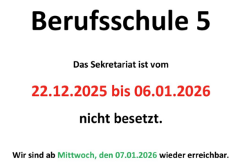 Berufe ansehenLiebe Schülerinnen und Schüler, liebe Eltern und Ausbilder, wir möchten Sie darüber informieren, dass die Berufsschule 5 der Stadt Augsburg während der Winterferien vom 22. Dezember 2025 bis zum 06. Januar 2026 geschlossen bleibt.