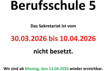 Ganze News lesen >Am 10.03.2026 findet ab 16:15 bis 17:00 Uhr eine Infoveranstaltung der Schulleitung der Berufsschule 5 statt. Sie sind herzlich eingeladen, daran teilzunehmen. Im Anschluss findet der Eltern- und Ausbildersprechtag von 17:00 bis 20:00 Uhr statt. Buchen Sie Gespräche mit den Lehrkräften.