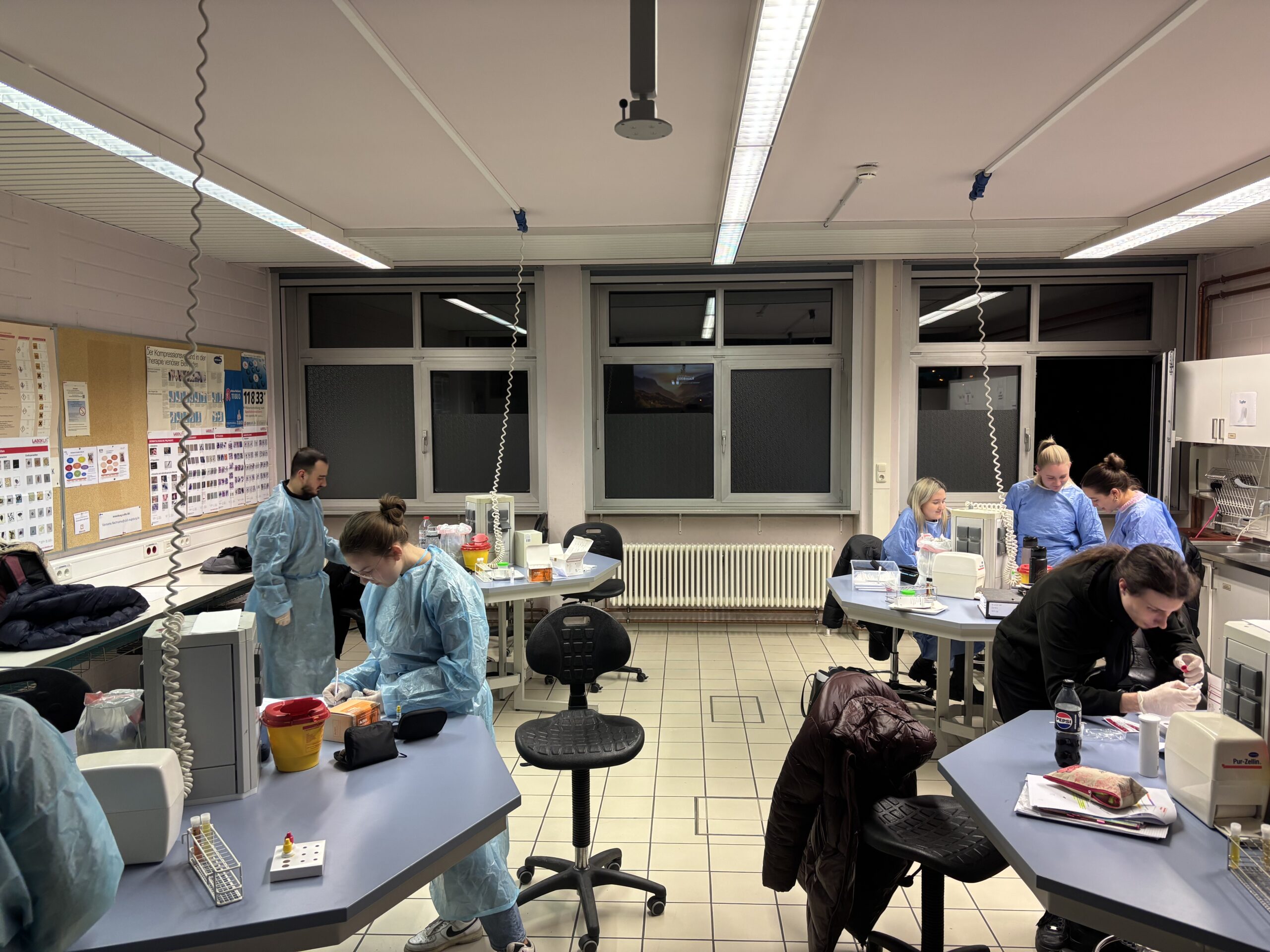 Trotz eines langen Unterrichtsabends hat sich die Winter-Abschlussklasse der Medizinischen Fachangestellten mit beeindruckendem Engagement auf die bevorstehende praktische Prüfung vorbereitet. Im Laborkurs wurde nichts dem Zufall überlassen: Von der präzisen Urinstix-Analyse bis zur fachgerechten Blutabnahme – alle wichtigen diagnostischen Tätigkeiten wurden intensiv trainiert.